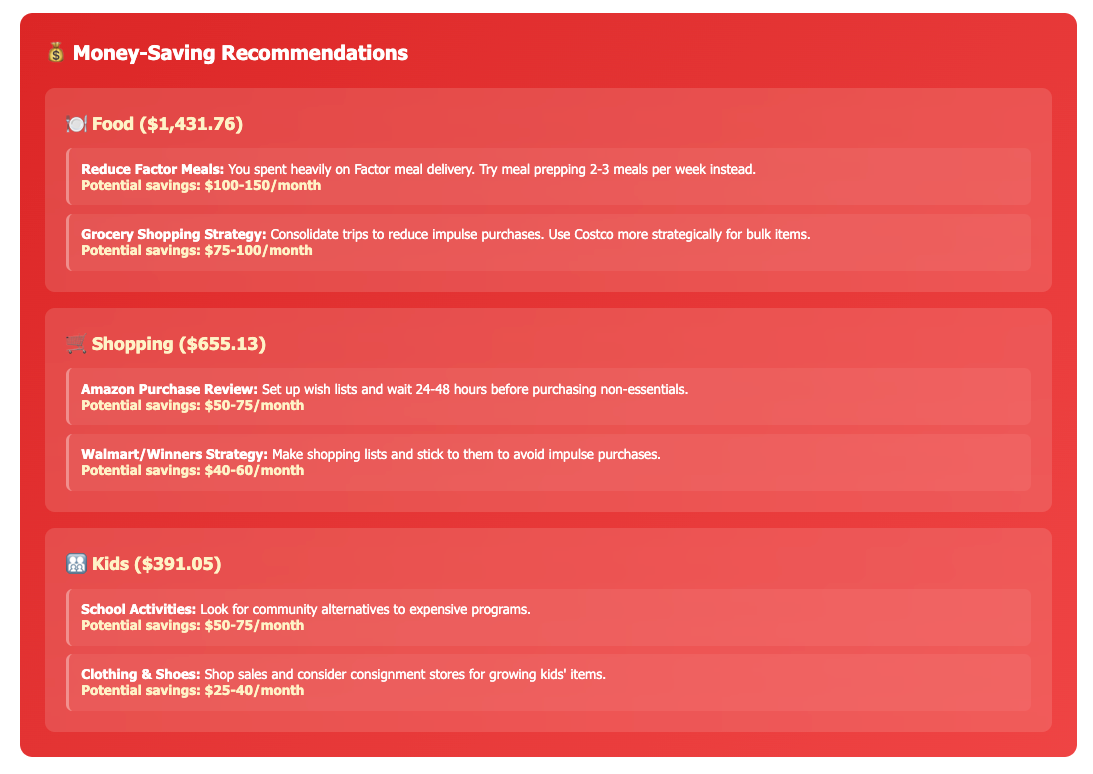 Step 3: Recommend & Deliver to Email - It generates money-saving recommendations for each category sent to my email.